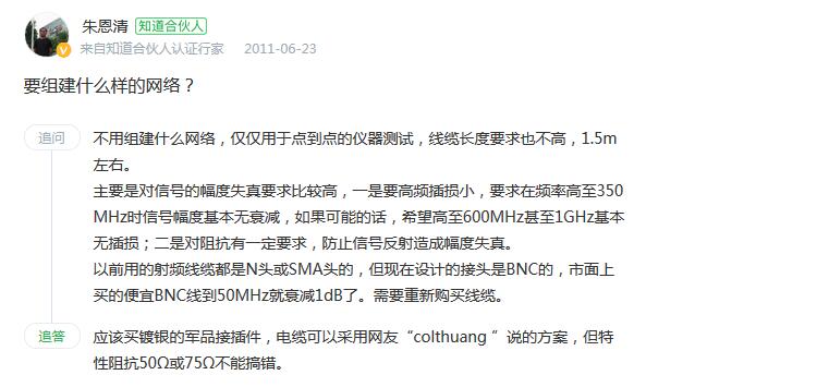 不用組建什么網(wǎng)絡(luò),僅僅用于點(diǎn)到點(diǎn)的儀器測(cè)試,線纜長(zhǎng)度要求也不高,1.5m左右。主要是對(duì)信號(hào)的幅度失真要求比較高,一是要高頻插損小,要求在頻率高至350MHz時(shí)信號(hào)幅度基本無衰減,如果可能的話,希望高至600MHz甚至1GHz基本無插損;二是對(duì)阻抗有一定要求,防止信號(hào)反射造成幅度失真。以前用的射頻線纜都是N頭或SMA頭的,但現(xiàn)在設(shè)計(jì)的接頭是BNC的,市面上買的便宜BNC線到50MHz就衰減1dB了。需要重新購(gòu)買線纜。
