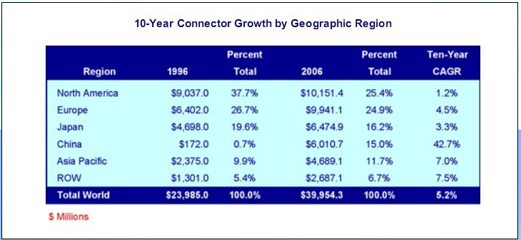 中國連接器的市場發(fā)展再次證明中國是世界工廠. 附表是全球各大區(qū)域連接器市場統(tǒng)計