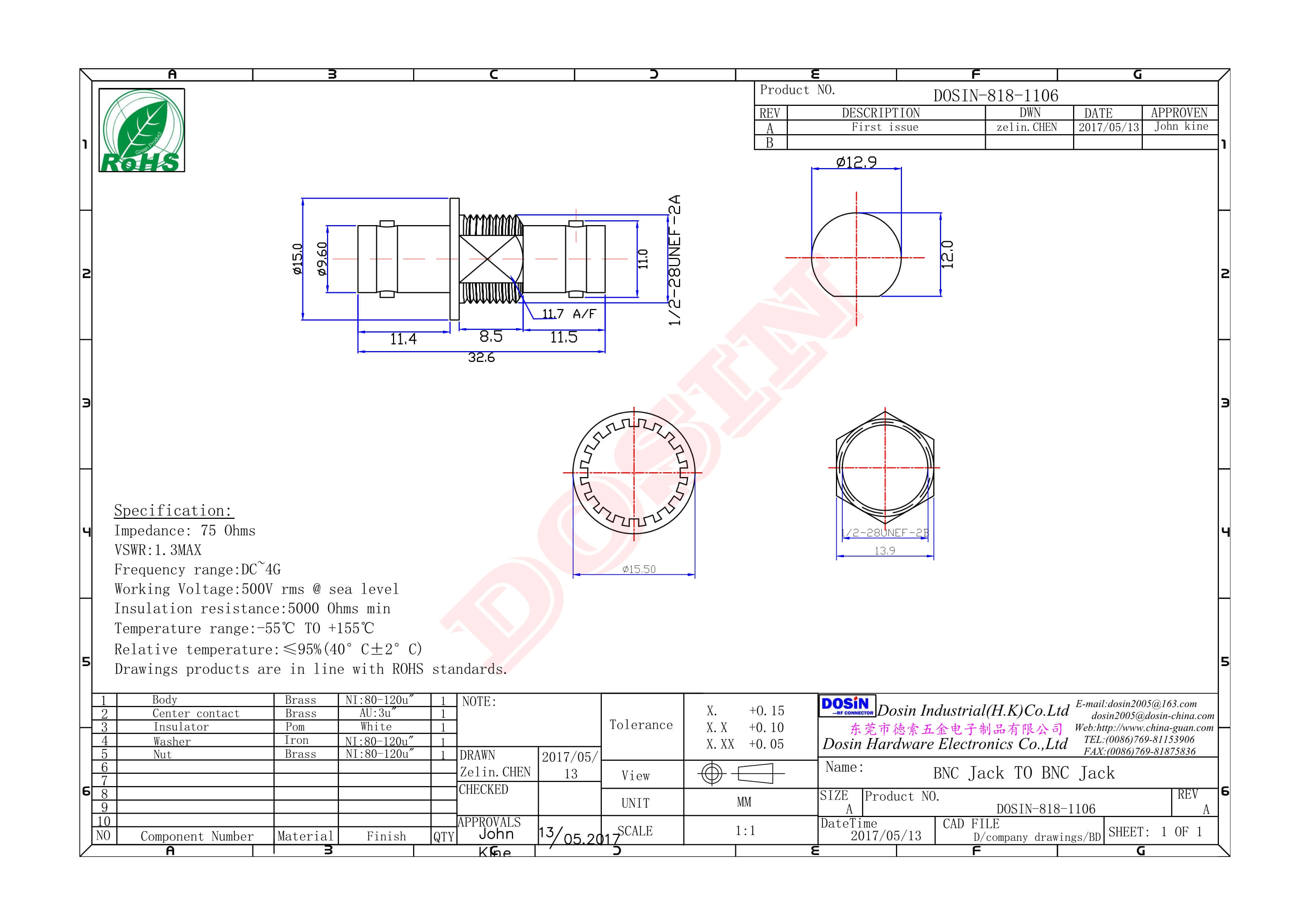 | 電壓駐波比 | 直式 ≦ 1.22/3GHz / 彎式 ≦ 1.30/3GHz |